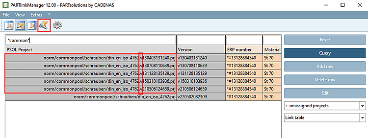 Alte Bauteilversionen erkennen Sie im PARTlinkManager, in der Spalte PSOL Projekt an der Versionsnummer im Projektpfad. Außerdem gibt es in einem Projekt dann zur gleichen Zeilen ID [Line ID] mehrere Zeilen subID [Line sub ID].