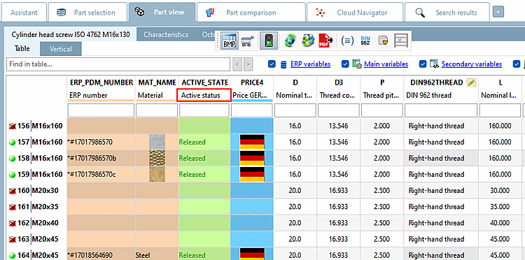 Voraussetzung: Wenn TRANSLATIONTABLE für bestimmte ERP-Nummern, Variablen und Sprachen mit Werten befüllt ist und genau diese Variablen in dieser Option auf "Ja" gesetzt wurden, werden diese in 3Dfindit bzw. PARTdataManager angezeigt.