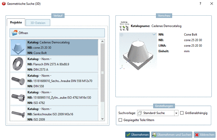 Schließt das Dialogfenster und startet die Geometrische Suche (3D) unmittelbar.