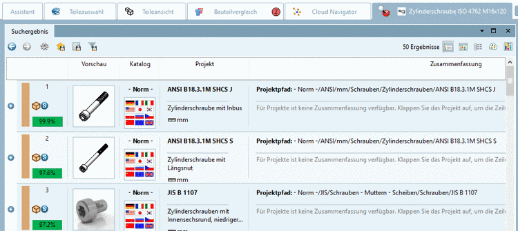 Optional können Sie Bauteile in den Bauteilvergleich laden (tabellarischer Vergleich und 3D/2D-Vergleich). Siehe hier.
