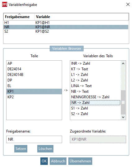 Wählen Sie Teil und Variable des Teils (hier KP1 und NR).