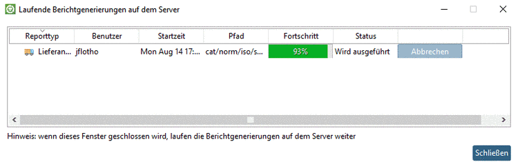 Sobald eine Analyse gestartet wurde, öffnet sich das Dialogfenster Laufende Berichtgenerierungen auf dem Server: