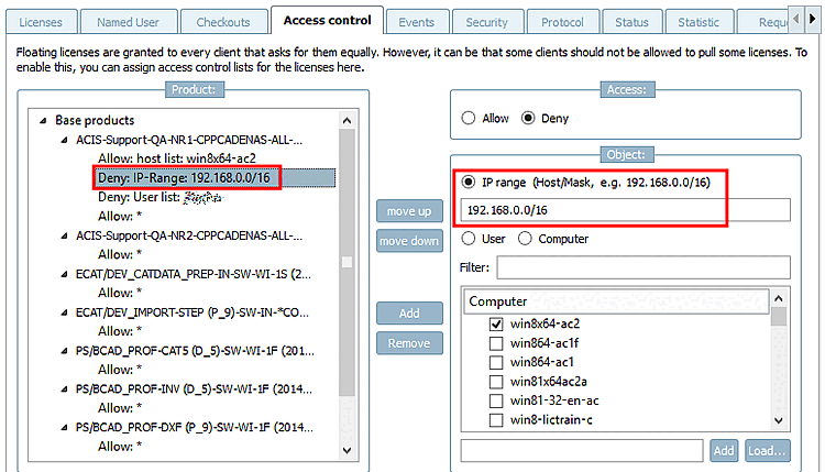 Floating Lizenzen werden an alle anfragenden Rechner gleichberechtigt verteilt. Nun kann es aber sein, daß bestimmte Produkte nicht an alle Rechner oder Benutzer verteilt werden sollen. Um das zu ermöglichen, können hier Zugriffslisten für die Produkte hinterlegt werden. [Floating licenses are granted to every client that asks for them equally. However, it can be that some clients should not be allowed to pull some licenses. To enable this, you can assign access control lists for the licenses here.]