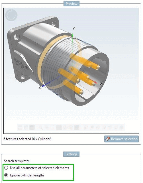 Verwenden Sie in einem solchen Fall die Suchvorlage Zylinderlängen ignorieren [Ignore cylinder lengths].