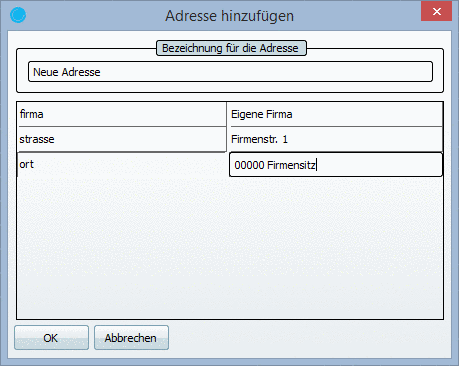 Dieser Button öffnet das Dialogfenster Adresse hinzufügen. In diesem Fenster können Sie weitere Adressen für Ihre Firma anlegen und mit OK in die Liste der Adressen übernehmen.
