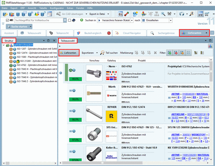 die gefundenen Vergleichsteile angezeigt. Die Prozentwerte bei den
