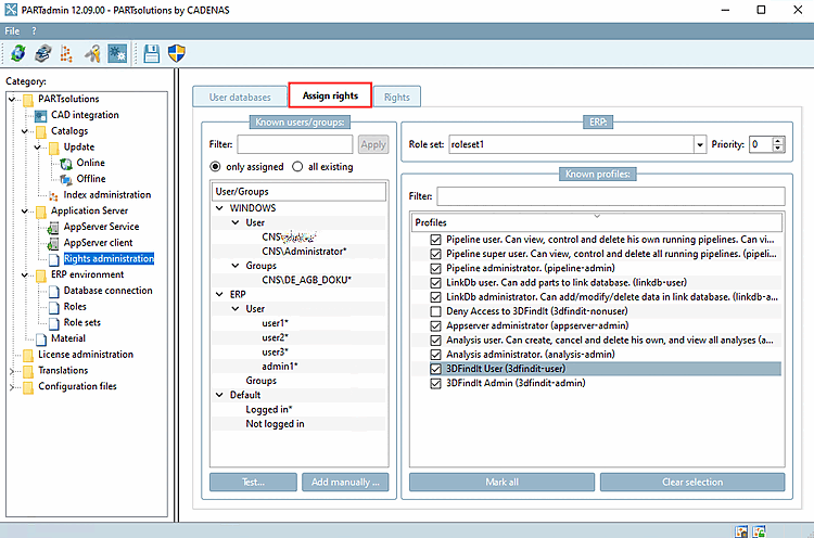 Bei Verwendung von 3dfindit ist in PARTadmin unter Profile [Profiles] für die berechtigten User und Gruppen mindestens 3Dfindit User zu aktivieren; es besteht sonst kein Zugriff auf 3Dfindit.