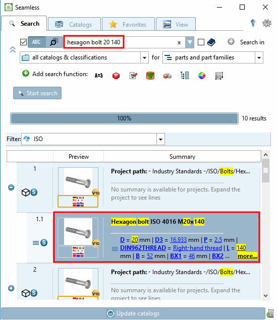 Sie können bereits beim Suchen gezielt auf bestimmte Ausprägungen abstellen, beispielsweise bei der Volltextsuche [Full-text search] durch Angabe von Parametern oder durch eine Geometrische Suche (3D) [Geometric search (3D)].