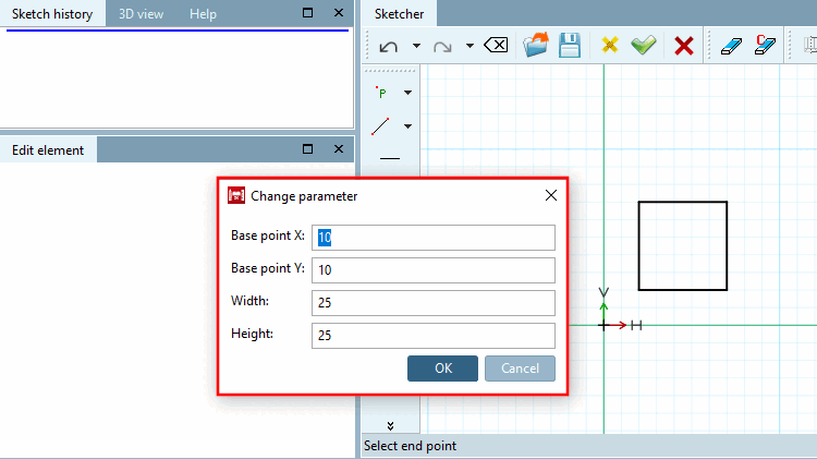 Sobald ein Konstruktionsschritt ausgeführt wurde, werden im Dockingfenster Element editieren [Edit element] die einzelnen Parameter angezeigt.