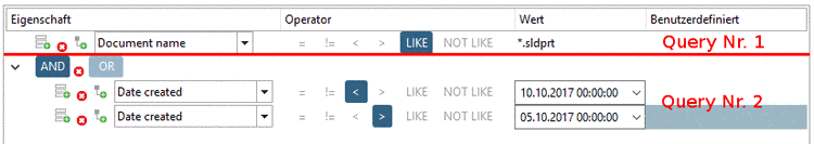 Query Nr. 2: Alle Teile, die zwischen 05.10.2017 und 10.10.2017 erstellt wurden, werden importiert. Die Bedingung von Query 1 wird hier nicht berücksichtigt. Query 2 importiert also hier im Beispiel auch Teile mit Dateiendung .sldasm.