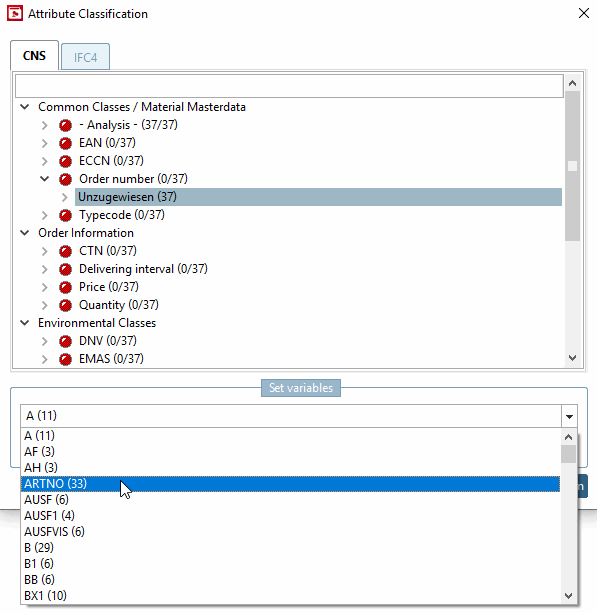 Klappen Sie unter Set variables das Listenfeld auf und selektieren Sie die Variable, welche den entsprechenden Wert zum selektierten Klassenmerkmal enthält (hier "ARTNO").