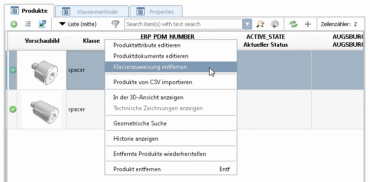-> Sofort nach Ausführen des Befehls wird das Produkt nicht mehr auf der Registerseite Produkte der entsprechenden Klasse angezeigt.