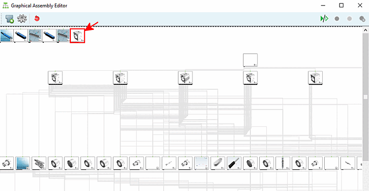 Der Grafische Baugruppen Editor stellt die gesamte Baugruppenstruktur mit Teilen, Anfügepunkten und Regeln in einem eigenen Fenster übersichtlich dar. Wird ein Element selektiert, wird es ebenfalls im Konfigurator [Configurator], 3D-Ansicht [3D view] und Aufbau [Assembly] Dockingfenster (Strukturliste) markiert, sodass jederzeit während des Arbeitsprozesses gewechselt werden kann.