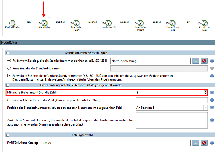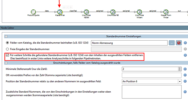 Für weitere Schritte die gefundene Standardnummer (z.B. ISO 1234) von den Inhalten der ausgewählten Feldern entfernen. Dies beeinflusst in erster Linie weitere Analyseschritte in folgenden Pipelineknoten. [Remove found Standard number (e.g. ISO 1234) from selected fields for further steps in pipeline]: