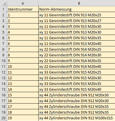 Die folgenden Darstellungen basieren auf nebenstehender CSV-Datei, in der sich die entscheidenden Angaben in einer einzigen Spalte befinden (hier "Norm-Abmessung").[a] Befinden sich im Feld neben den entscheidenden Kerndaten irgendwelche weitere Informationen, die aber für die Zuweisung keine Bedeutung haben, müssen zusätzliche Informationen geliefert werden, welche die Kerndaten erkennbar machen. Beispiel (nebenstehende Abb.): Eine für die Zuweisung nicht wichtige Information enthält der String "xy <Zahl>". |
