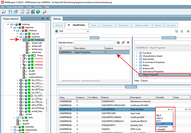 Tabellenvariablen aus den Norm- bzw. Herstellerkatalogen oder feste Werte können über das Dialogfenster Klassenvariablen [Class variables] eCl@ss-Merkmalen zugeordnet werden. Nach diesen eCl@ss-Merkmalen (Begriffen) kann später im PARTdataManager gesucht werden.