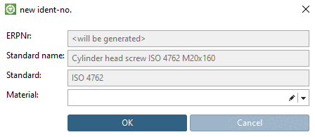 Bestimmen Sie, welche Felder im Dialog Neue Ident-Nummer [new ident-no.] angezeigt werden sollen, ob ein Vorbelegungswert eingetragen werden soll und ob Änderung möglich sein soll. Siehe hierzu Abschnitt 4.11, „ Gestaltung Dialogfenster "Neue Ident-Nummer" - erpcustom.cfg -> Block [USERDIALOG] “. Hier im Beispiel wird neben der automatisch vergebenen ERP_PDM_NUMBER zusätzlich z.B. das Material angezeigt.