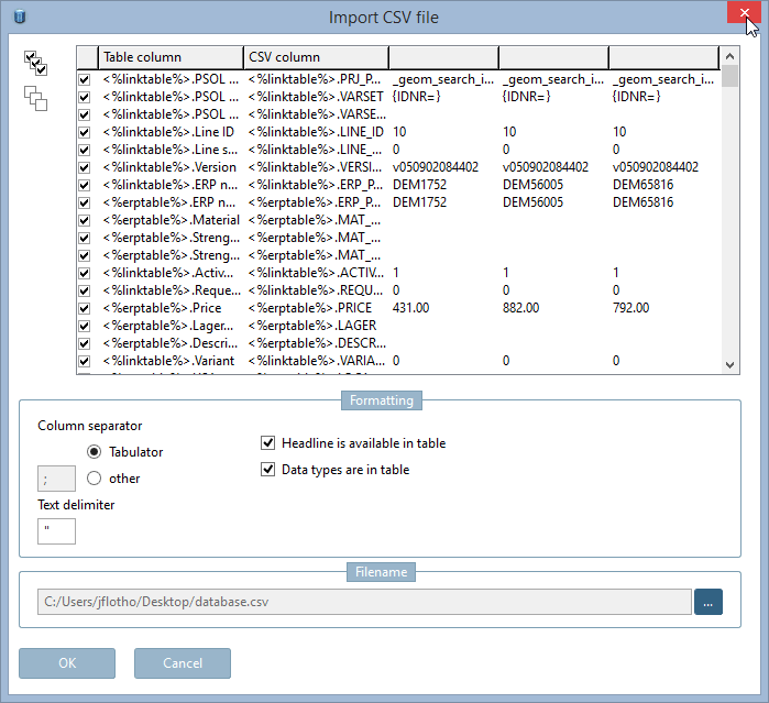 Der Haken bei Kopfzeile in Tabelle vorhanden [Headline is available in table] muss wiederum gesetzt sein (siehe auch unter Export!), denn damit wird die Spaltenzuordnung sofort erkannt. Voraussetzung ist selbstverständlich, dass die CSV-Datei ebenfalls eine Kopfzeile enthält.