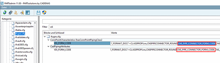 ifugnx.cfgauf ein NX-Merkmal gemappt werden (hier im Beispiel "VDI_FORM_CODE"), einmal unterConnPointCharacteristics(hasConnPointPipingClass)[hier wird der Wert den einzelnen Ports als Charakteristikum zugewiesen] und einmal unterCadPipingAttributes[hier deklarierte Merkmale kommen in der Tabelle an].Damit das Merkmal in der Routing Reuse Search zur Verfügung steht, muss es in