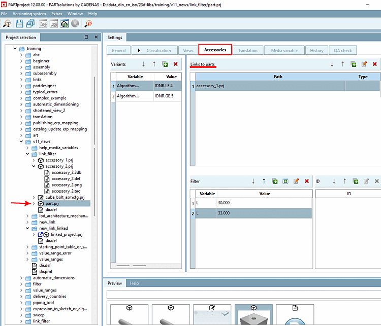 Bauteile, die im Dialogbereich Links auf Teile [Links to parts] eingetragen wurden, werden im PARTdataManager im Dockingfenster Verweise [Links] bei Auswahl Zubehör [Accessories] dargestellt.