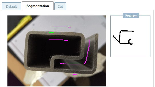 Markieren Sie die äußere (grün = Bauteil) und innere Kontur (lila = Löcher) des Bauteils, entweder als Freihandlinie oder mit der Option Kantenerkennung aktivieren [Activate border detection] (meist besser).