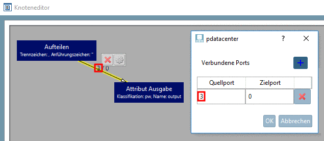 Angenommen man hat den String „A,B,C,D,E“ und möchte „D“ weitergeben, müsste man die Option Alle Elemente als Liste ausgeben deaktivieren, das Trennzeichen „,“ einstellen und den Quellport in der weiterführenden Kante auf 3 (Index des Wertes; 0 = A, 1 = B, …) setzen. (Anführungszeichen sind hier Hilfsmittel, falls das Trennzeichen auch im Wert vorkommt (z.B. „'A,A','B,B'").)
