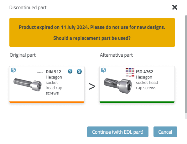 Icons und Dialoge signalisieren, ob ein Teil verwendet werden kann und ob Alternativteile zur Verfügung stehen.