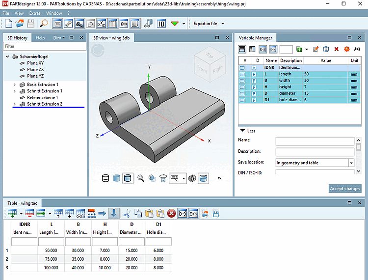 PARTdesigner öffnet sich mit den Dockingfenster 3D Historie [3D History], 3D Ansicht [3D view], Variablenmanager [Variable Manager] und Tabelle [Table].