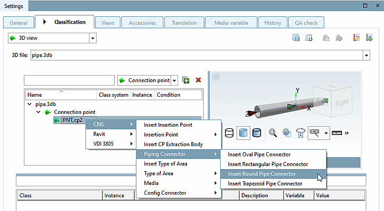 In der Praxis wird eine Vielzahl von Klassifizierungen über Anfügepunkte vorgenommen (beispielsweise für Rohranschlüsse). Siehe auch Abschnitt 5.12.8, „ Normteile klassifizieren für Platzierungsdialog “.