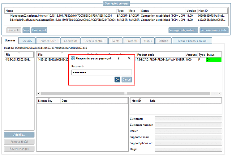 Ist bereits eine Lizenz eingespielt (dies ist der Fall bei Option Server aus lokaler Konfiguration übernehmen [Use server from client configuration] und Bestehenden Lizenzserver konfigurieren [Configure existing license server], dann öffnet sich das Dialogfenster Bitte Server-Passwort eingeben [Please enter server password].