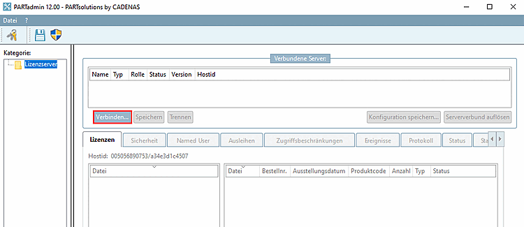 Damit Sie den Lizenzserver administrieren können, müssen Sie sich zuerst mit ihm verbinden. Ohne Verbindung sind alle Registerseiten inaktiv.