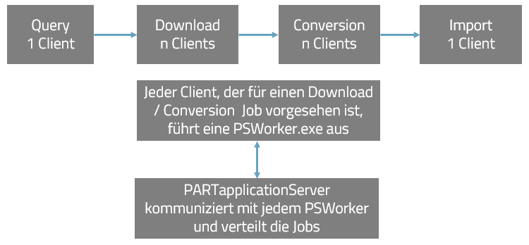 Sie können den Download und den Conversion Dienst auf mehrere Maschinen verteilen. Query und Import Dienst werden nicht verteilt. Der PARTapplicationServer verteilt die Jobs auf die gewünschten Clients.