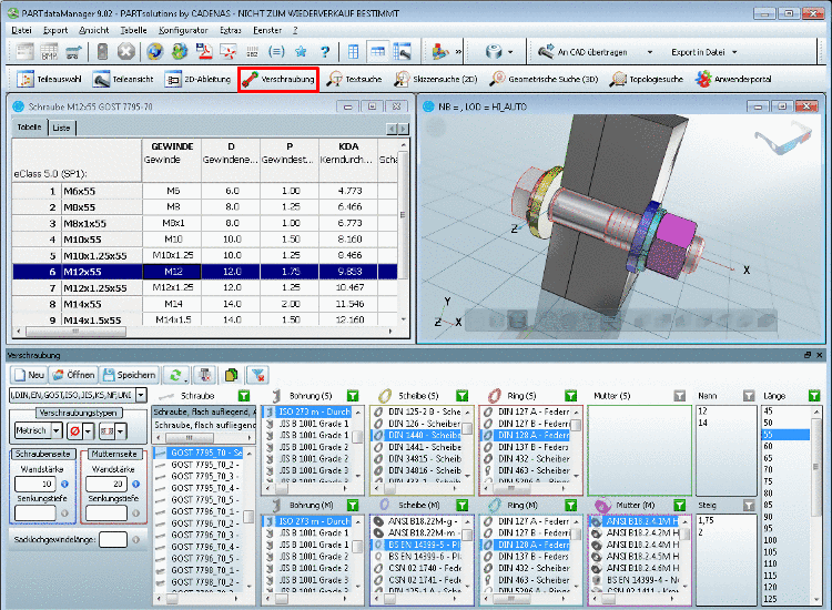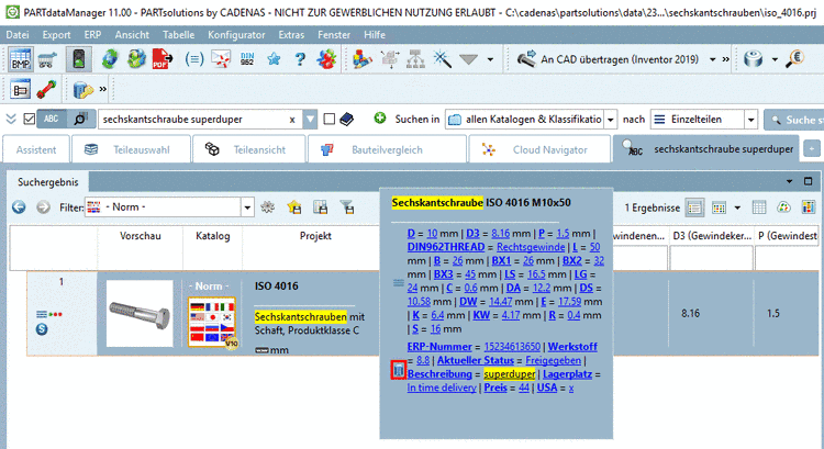 Vergessen Sie nicht diesmal Suche nach Teilefamilien und Einzelteilen zu verwenden. Der Suchbegriff "sechskantschraube" würde unnötig eine riesige Menge an Treffern verursachen. | |