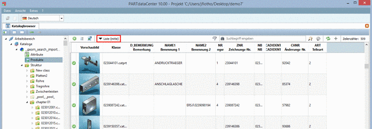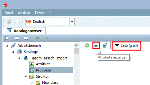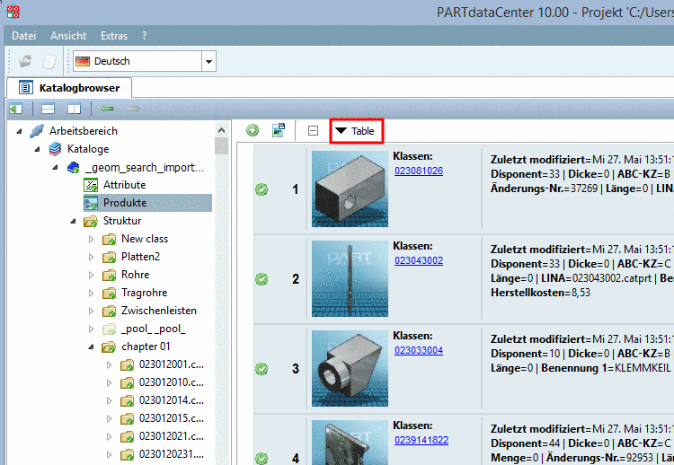 Beim Ansichtstyp Tabelle werden alle Attributnamen in einem einzigen Feld hintereinander aufgeführt. Außerdem können Sie hier eine textuelle Suche über alle Produkte durchführen. Rechts oben wird die Gesamtzahl aller Produkte angezeigt.
