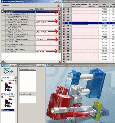 Die folgende Abbildung zeigt eine komplexe Baugruppe, mit Unterbaugruppen. Für die oberste Baugruppe wurde noch keine ERP/PDM-Nummer zugewiesen (rote Statusanzeige der Sachmerkmalstabelle). Einige Einzelteile haben bereits ERP/PDM-Nummern (grüne Statusanzeige im Aufbau-Dockingfenster).
