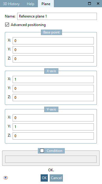 Beispiel: Die Referenzebene wird in Richtung der Y-Achse (nicht die des globalen Koordinatensystems, sondern die des selektierten KOS. [siehe obige Abb.]) with the value of "-10" verschoben und um 45° um die X-Achse (nicht die des globalen Koordinatensystems, sondern die des selektierten [siehe obige Abb.]) rotiert.