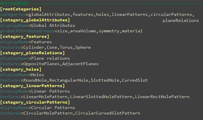 Die aufgelisteten Features und globalen Attributgruppen (globalAttributeGroups) in den Kategorien werden in der Config in weiteren Blöcken genauer definiert (z.B. [feature_Cylinder] oder [globalAttributeGroup_symmetry]). Einer Kategorie können sowohl globale Attributgruppen als auch Features hinzugefügt werden.