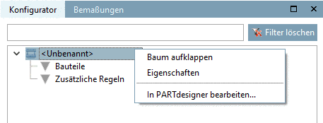 Auf oberster Ebene (Baugruppe) finden sich die Kontextmenübefehle Baum aufklappen, Eigenschaften und In PARTdesigner bearbeiten....