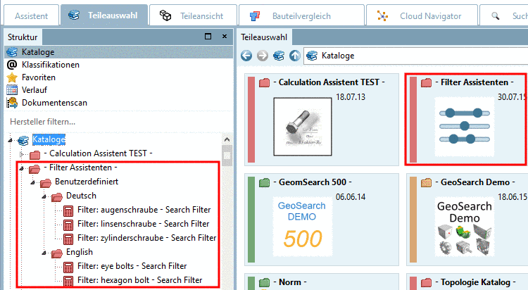 Selektieren Sie beispielsweise auf der Registerseite Teileauswahl den Unterpunkt Kataloge oder Klassifikationen und durchsuchen Sie die jeweilige Verzeichnisstruktur nach dem gewünschten Bauteil.