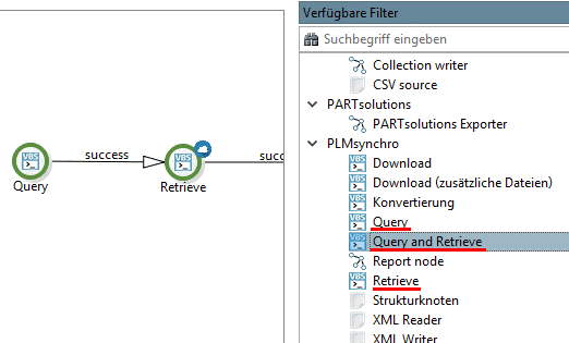 Bei PLM Synchro mit PDM-System bringt das Aufsplitten des Knotens Query and Retrieve durch die Einzelknoten Query und Retrieve durch Parallelisierung auf verschiedenen Rechnern Performancegewinn und Einsparung von Speicher.