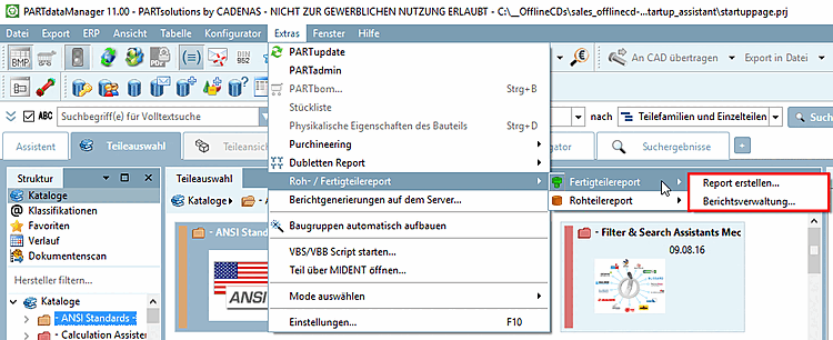 Rohteilereport [Unmachined part report] -> Berichtsverwaltung... [Report management...]