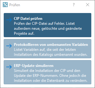 Prüfen der CIP-Datei auf Fehler. Listet außerdem neue, gelöschte und geänderte Projekte auf. [Checks CIP file for errors. Additionally lists new, deleted or changed projects.]