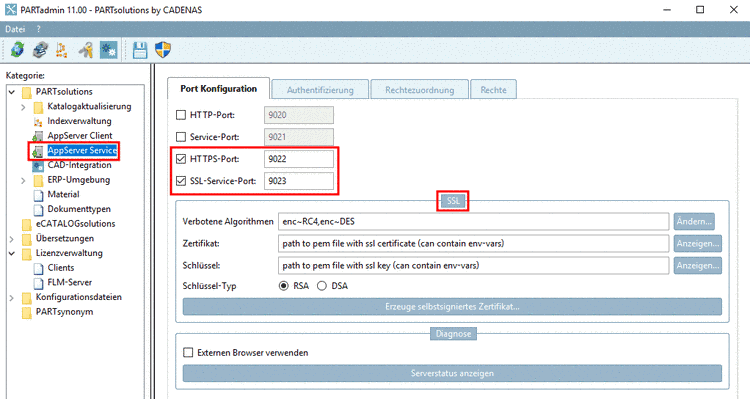 In PARTadmin unter AppServer Service finden sich die Einstellungsoptionen zu Authentifizierung, Rechtezuordnung und Rechte. Wichtig ist auch, für die Port Konfiguration HTTPS / SSL zu verwenden (siehe unten).