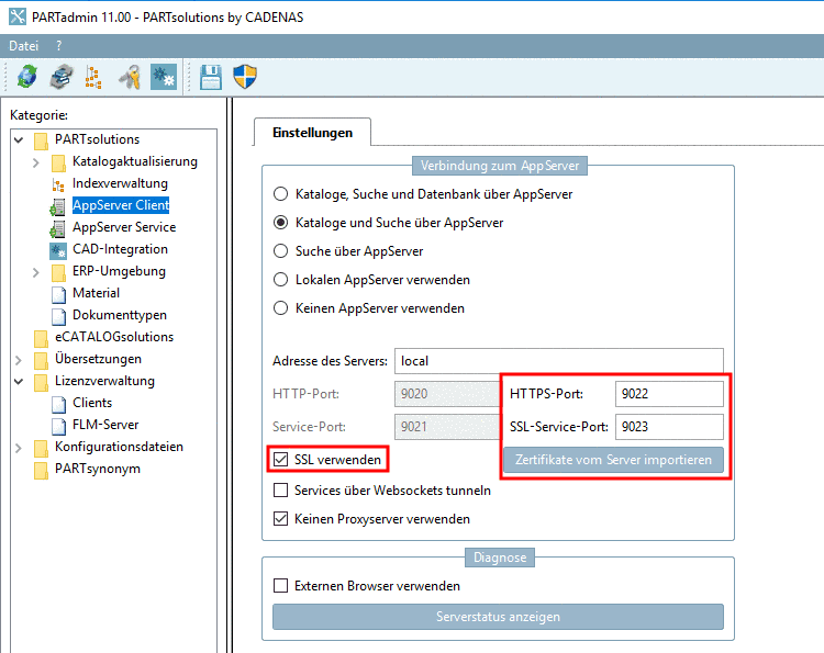 Aktivieren Sie unter Kategorie AppServer Client die Option SSL verwenden und importieren Sie das entsprechende Zertifikat vom Server. Siehe SSL-Verschlüsselung.
