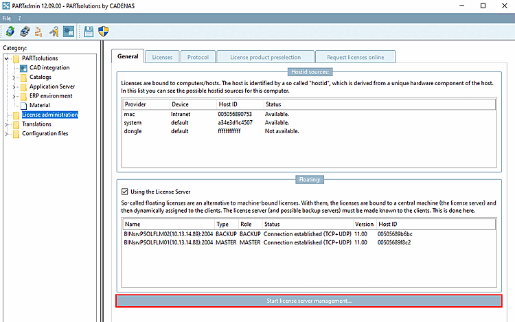 Starten Sie die Lizenzserver Lizenzverwaltung, indem Sie in Ihrer Installation (z.B. PARTsolutions Enterprise) in PARTadmin -> Kategorie Lizenzverwaltung [License administration] den Button Starte Lizenzserver-Verwaltung... [Start license server management...] klicken.