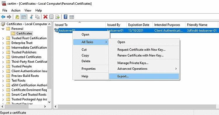 To export the certificate right-click on the certificate and select All Tasks -> Export.
