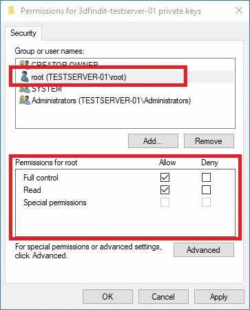 Click to add a local server user (in this case user „root“) to the list of users that have permissions to use the certificate.