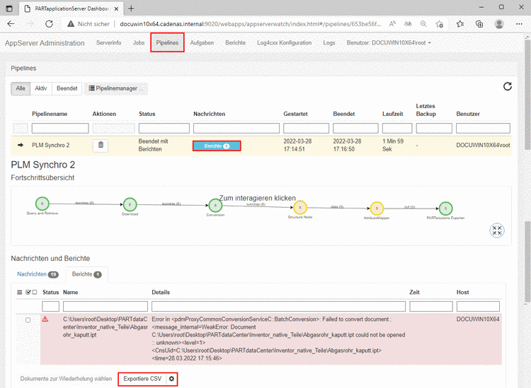 Im Dashboard, auf der Registerseite Pipelines können Reports via Button Exportiere CSV als Datei exportiert werden.
