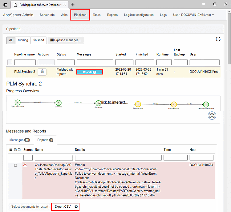 Im Dashboard, auf der Registerseite Pipelines können Reports via Button als Datei exportiert werden.