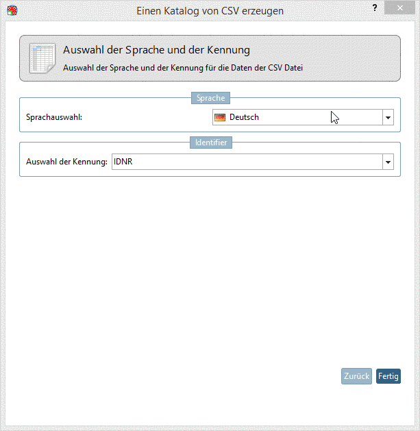 Datei erzeugen. Siehe hierzu Abschnitt 1.3.5.2, „Produkt hinzufügen“.Auswahl der Sprache und der Kennung